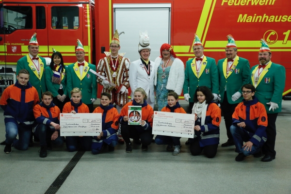 Am Donnerstag, den 08.02.2018, überreichte das Mainflinger Dreigestirn Prinz Andreas, Schimmel Eric und Seejungfrau Philipp, sowie der 1. Vorsitzende der Freunde des Mainflinger Dreigestirns Thorsten Pfister, mit einigen Ministern, insgesamt 500 € an die Jugendfeuerwehren der Gemeinde Mainhausen.